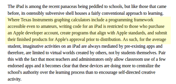 This article articulates a lot of the reasons why I see iPads as a bad thing for society: http://www.theatlantic.com/technology/archive/2013/08/Go-Ahead-Mess-With-Texas-Instruments/278899/ …pic.twitter.com/SY6OHtuW50