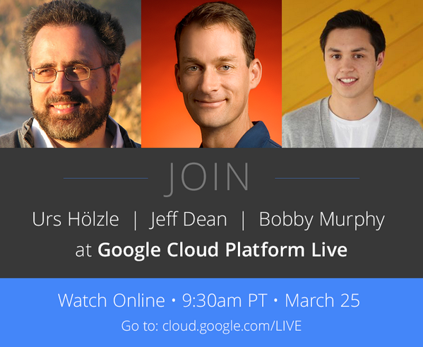 Cloud Platform Live. Streaming on 3/25 at 9:30am PT. Catch the news and hear our vision: http://goo.gl/tyqYjX pic.twitter.com/2yydQAmWoU