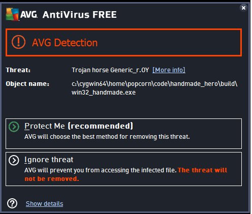 @cmuratori Apparently, if you don't have DefWindowProc as a default case, avg thinks it's a Virus!! Its fine if you do. @AVGFree