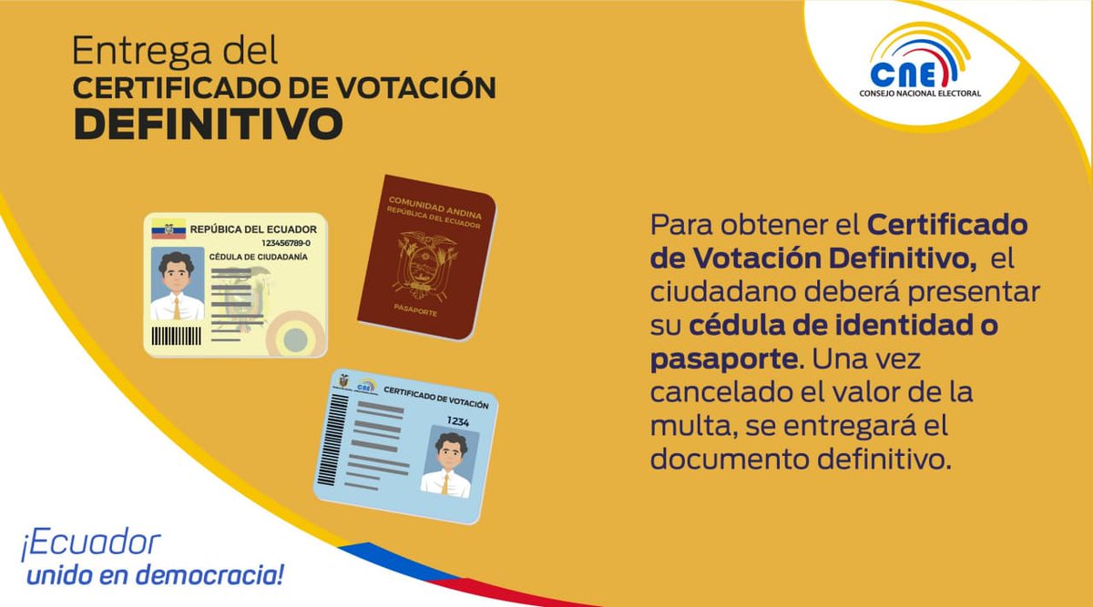 #CNEInforma | Recuerda que para obtener el Certificado de Votación Definitivo de las#Elecciones2021Ec no debes tener multas pendientes. Puedes justificar tu inasistencia únicamente en estos casos: https://bit.ly/3kj2VCZ .pic.twitter.com/jA5aIL6MxH