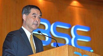 行政長官梁振英繼續訪問印度行程,早上參觀孟買證券交易所,並出席敲鐘儀式。他致辭時介紹香港金融中心的歷史,期望與孟買證劵交易所合作。 #梁振英 #特首訪印度 http://j.mp/1KpHzza pic.twitter.com/NWWybqiAGb