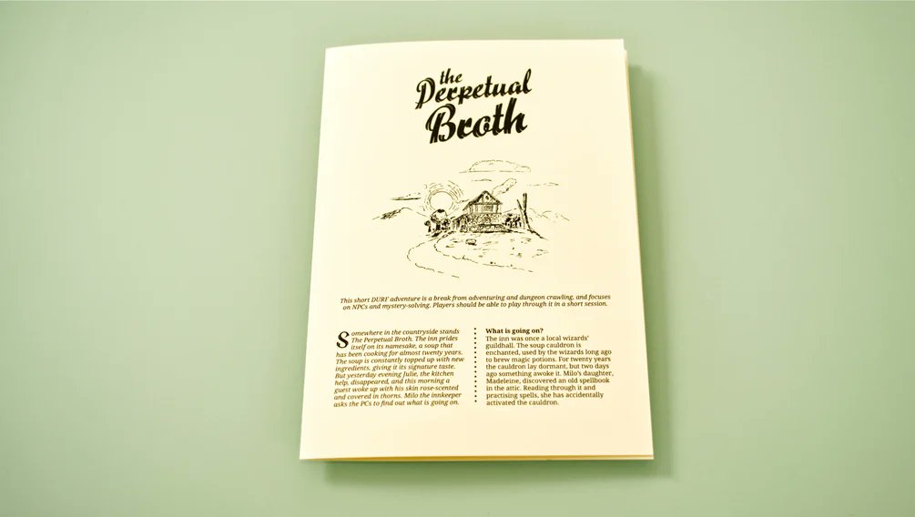 『The Perpetual Broth』 "DURF"という軽量ファンタジーTRPG用のミニシナリオ。本作は冒険メインではなく、宿屋で起こった事件を追うミステリーもの。注目ポイントは付属のペーパークラフトで、組み立てると宿屋ができます。かわいい!リンク先から物理+PDF版を購入できます https://thelostbay.gumroad.com/l/theperpetualbroth …pic.twitter.com/C14clOuwUN