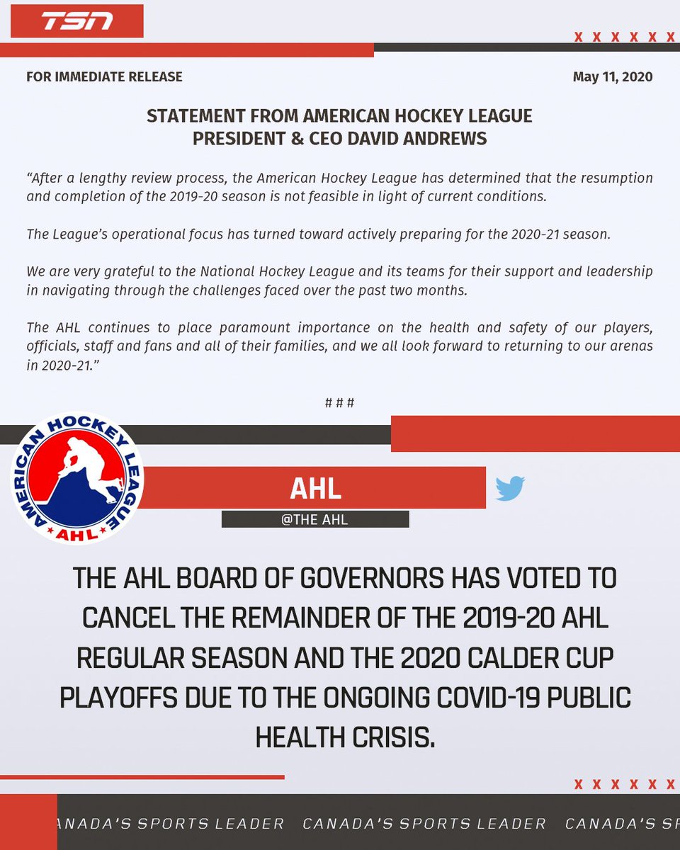 AHL cancels remainder of season, playoffs. MORE: https://www.tsn.ca/ahl-cancels-remainder-of-season-playoffs-1.1474497 …pic.twitter.com/h8ZxTJzCk0