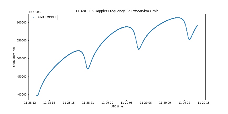 The initial lunar orbit of #Change5 has been fairly decently quantified using amateur Doppler data. 3x the period is almost exactly the 12/360 x 29.531 (lunar sidereal day). Circularization burn should happen ~12:35UTC today. 217x5585km, T= 28341s, i= 45.7deg.pic.twitter.com/RswR48mGHv