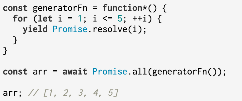 JavaScript's Promise `all()` function can operate on any JavaScript iterable, not just arrays. That means you can pass a generator to the `all()` function: https://pst.cr/5PJLp