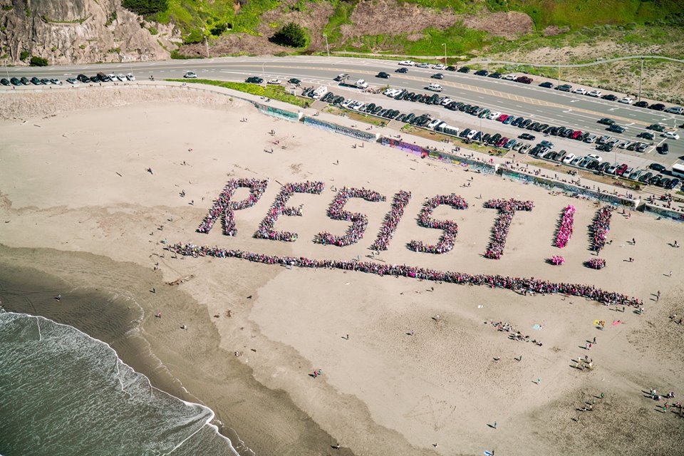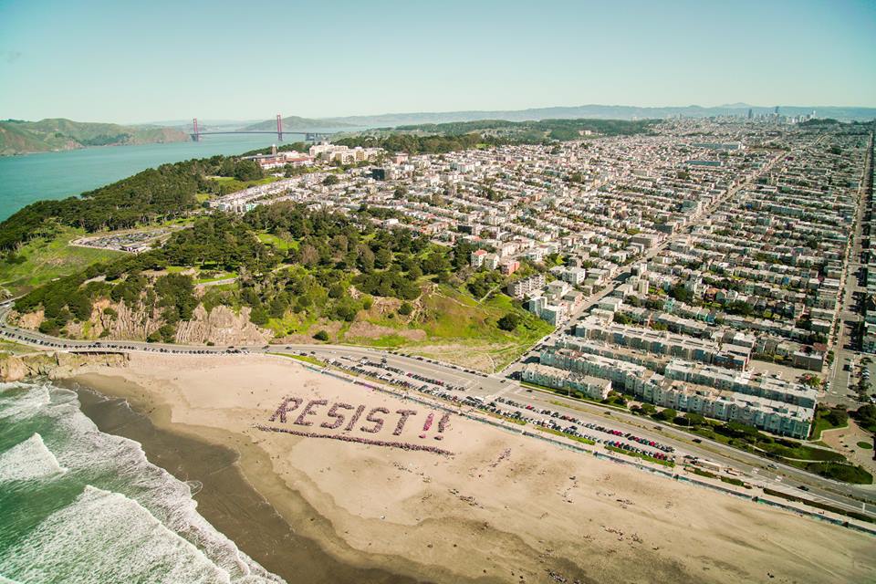 Aerial art! 1000s gather on the beach in San Francisco to spell out "Resist!!" Check out the CODEPINK exclamation point! Thanks Brad!pic.twitter.com/U5IyS3kB2x