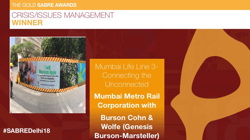 #SABREDelhi18 Winner Crisis/Issues Management Mumbai Life Line 3- Connecting the Unconnected: Burson Cohn & Wolfe (Genesis Burson-Marsteller) &@MumbaiMetro3pic.twitter.com/F4VM4upPJj