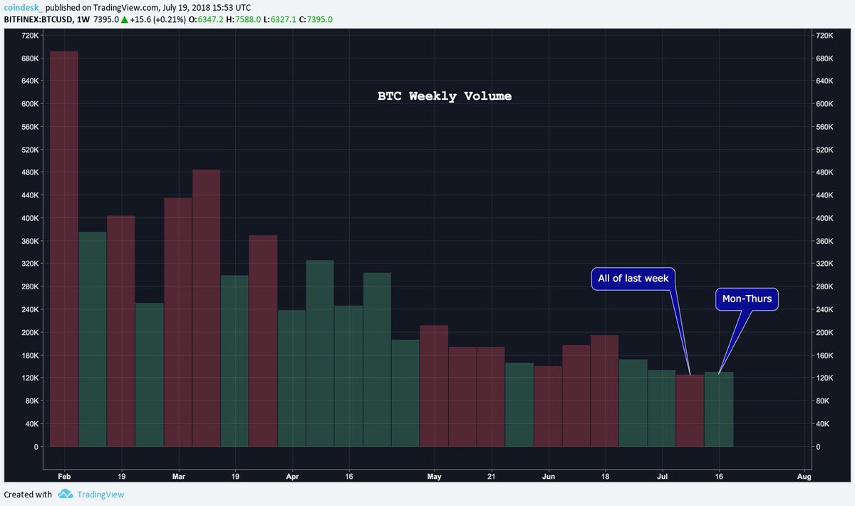 #BTC/USD weekly volume (Bitfinex) has already surpassed that of the entire prior week. First time#bitcoin weekly volume has outperformed its prior week since mid June.pic.twitter.com/sWYcEH8ckf