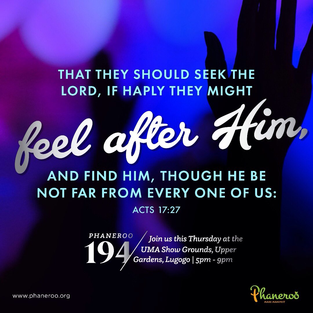 PHANEROO 194 Phaneroo 193 taught us that God is not found by people who do not FEEL AFTER Him! We learned that Feeling precedes true Faith. Hallelujah! Join us this Thursday, 9-10pm. UMA-SHOW GROUNDS as we continue to break more fallow ground.