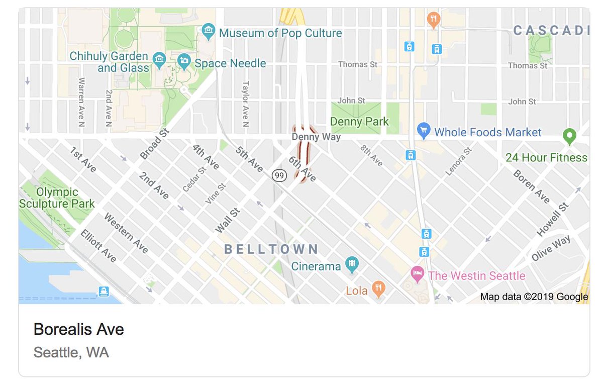 Just noticed today; stretch of road between Battery St. and 7th Ave has been renamed "Borealis Avenue". Great name for a street that is literally over Aurora ... and also is a canvas for confounding mysterious unpredictable movements where greens and reds seem to blur.pic.twitter.com/zfql6LLarr
