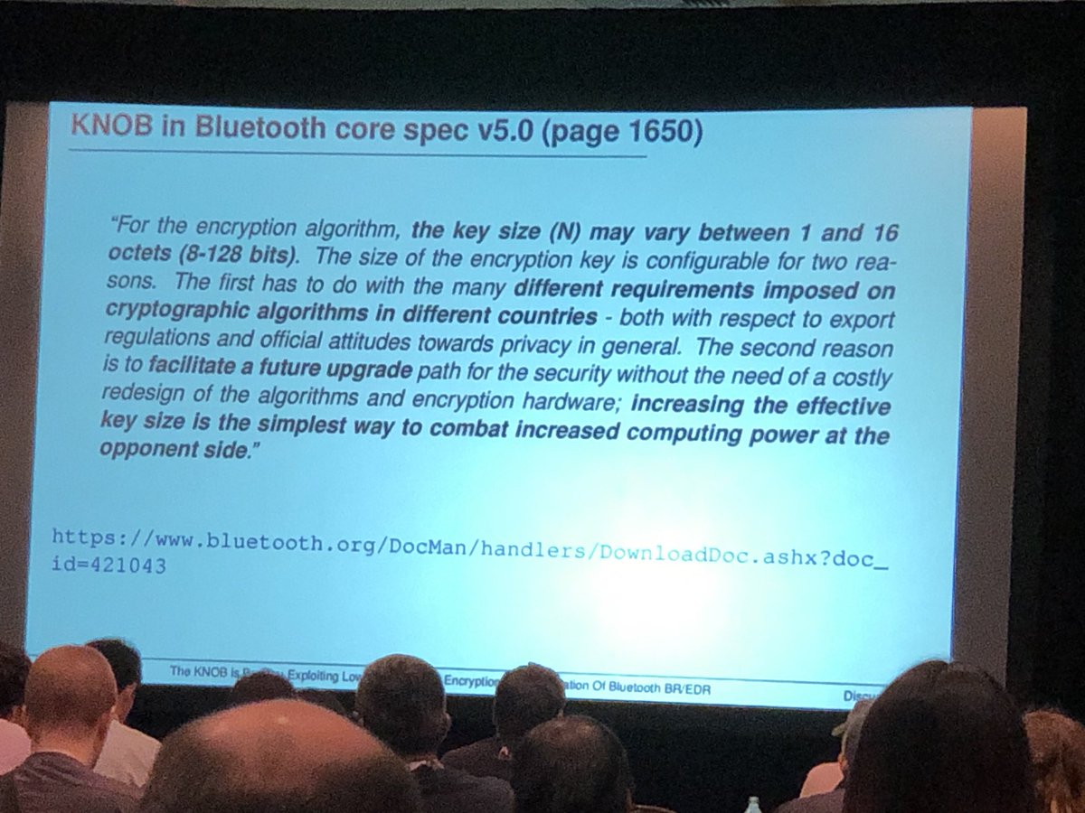 So the TL;DR of http://knobattack.com us that the Bluetooth spec allows one wide of the pairing key exchange to suggest a key length in bytes, and doesn’t authenticate it. The key size can be pushed down to 1 byte.
