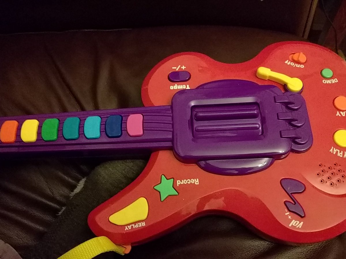 Trying to play my toddlers toy guitar. It is honestly hard to pull off.
