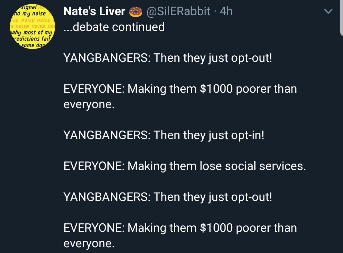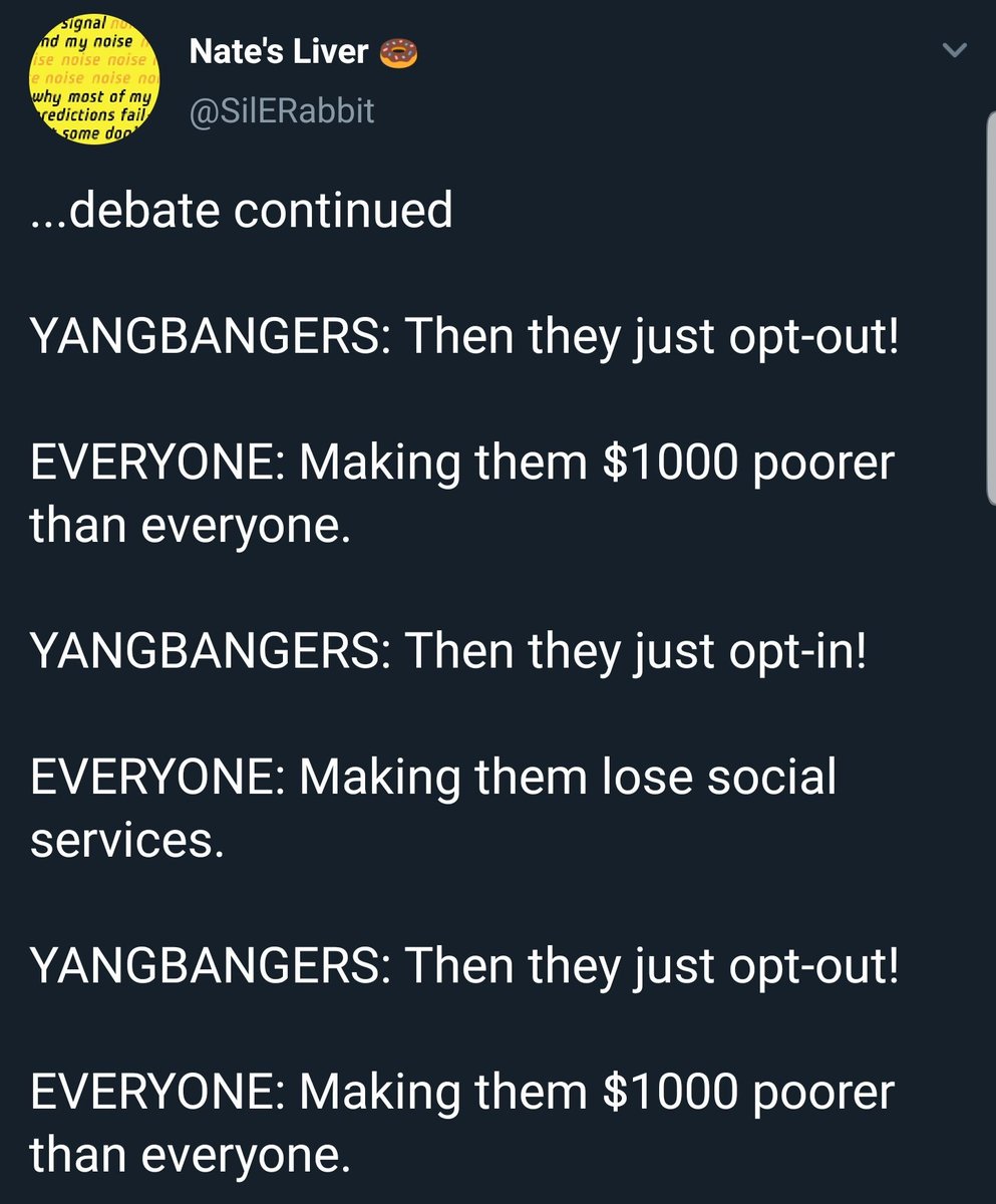 YANGHATERS: People who can’t work will be disadvantaged by the Freedom Dividend. YANGGANG: Wouldn’t they be disadvantaged by a minimum wage increase, using that logic? YH: No, that’s a right wing talking point! Trojan horse!!! YG: I'm literally homeless... YH: TROJAN HORSE!!!