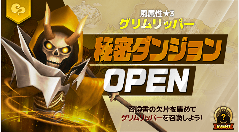 風属性★3「グリムリッパー」の秘密ダンジョンがオープン! 秘密ダンジョンでドロップする召喚書の欠片を集めてモンスターを召喚しましょう! 期間:6月4日 12:00~6月6日 24:00 「サマナーズウォー」のダウンロードはこちら! ⇒ http://bit.ly/1BwiIkC