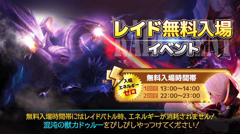 異界レイド入場無料イベントを開催! 混沌の獣カドゥルーを思いっきりやっつけてやりましょう! 期間:6月19日 ~ 6月20日 ▼タイムテーブル 1回目:13:00 ~ 14:00(1時間) 2回目:22:00 ~ 23:00(1時間) 「
