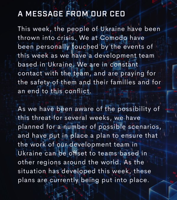 Our thoughts today are with the people of Ukraine, and particularly with the members of the Comodo team and their families who live there. We stand with you and support Ukraine during this difficult time.