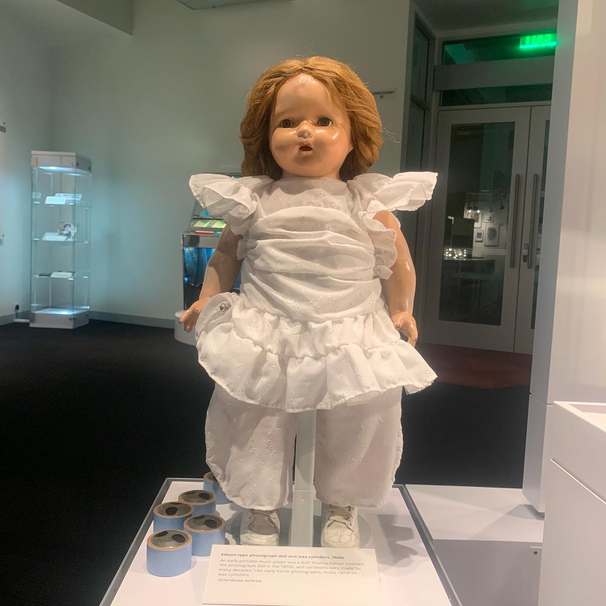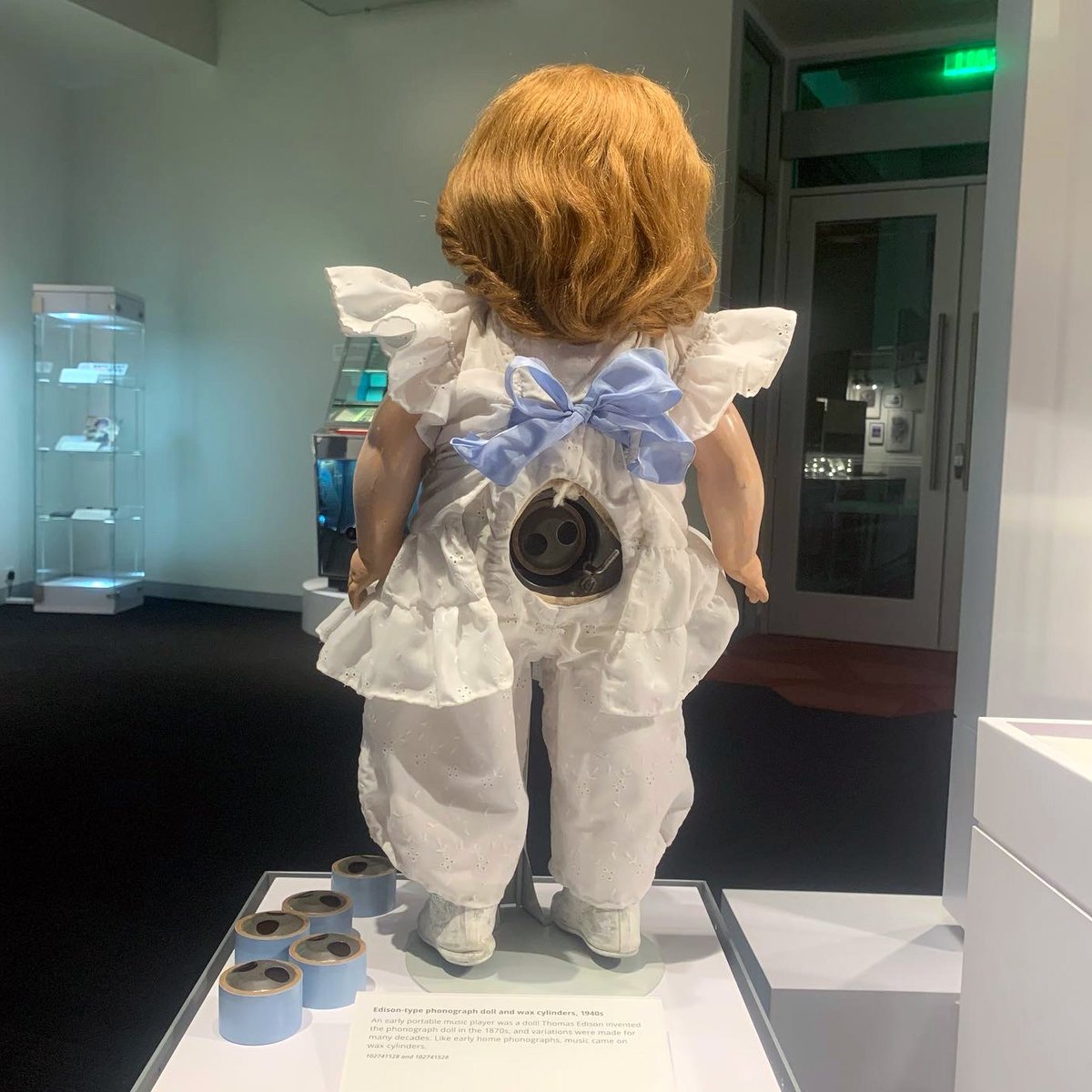 This 1940s Edison-type phonograph doll was an early portable music player! Aurora Tucker (CHM's Collections Manager) sewed a new outfit for her, which we're sure she feels cute in while she haunts our exhibit halls. #Halloweenpic.twitter.com/0J1dU6S7m5