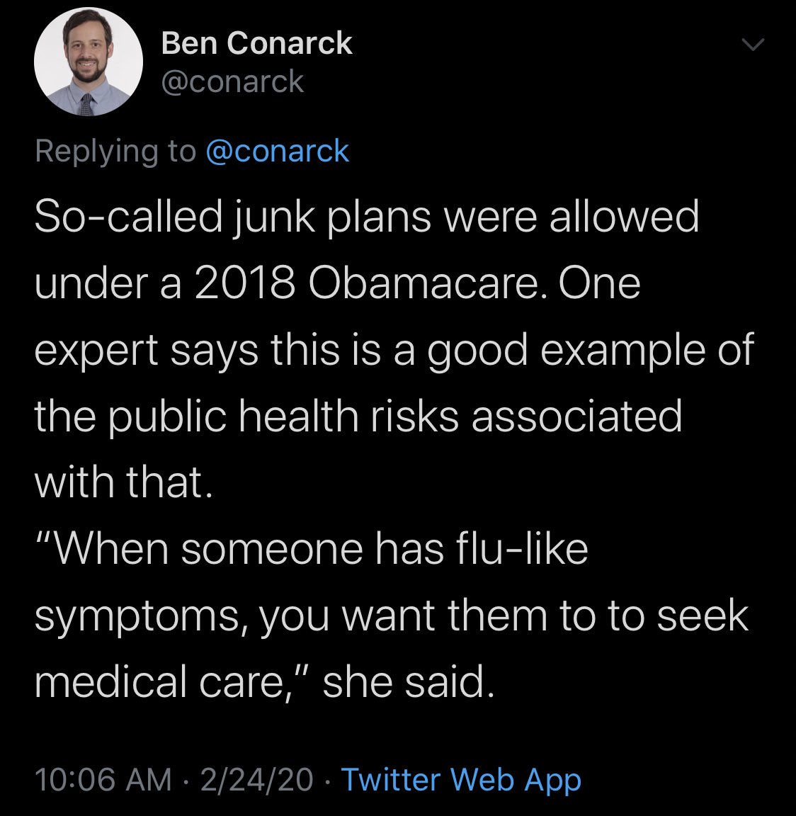 #COVID19 GU Prof. Sabrina Corlette: “When someone has flu-like symptoms, you want them to to seek medical care. If they have one of these junk plans & they know they might be on the hook for more than they can afford, [many] just won’t, & that is a public health concern.” ☤Thanks. Twitter will use this to make your timeline better. UndoUndo