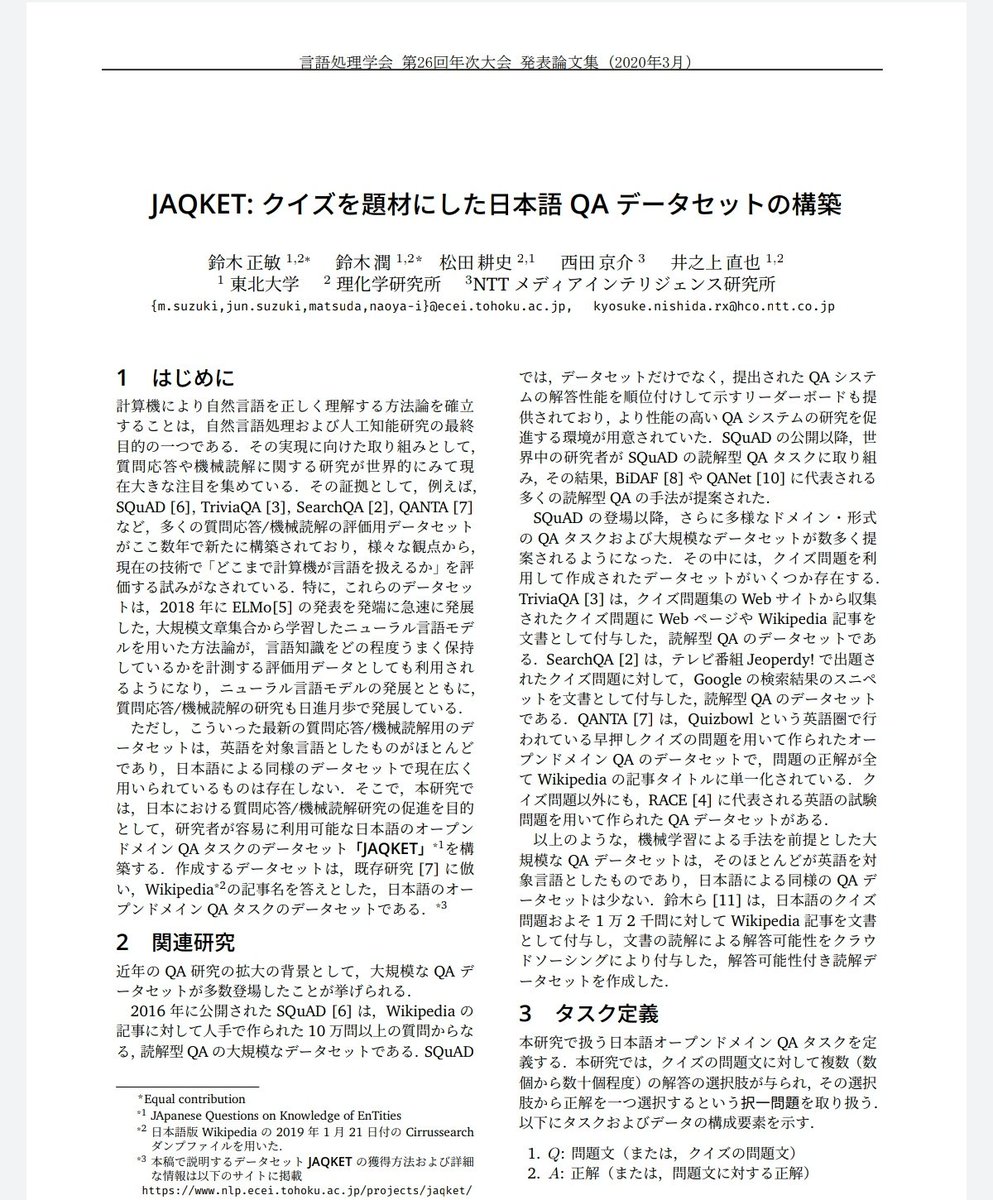 @NlpTohoku/理研/NTT共同で,クイズを題材とした日本語QAデータセットを構築しました&コンペを開催します!あなたの作ったAIがクイズ王になるかもしれません!詳細は#NLP2020 本日 13:15- ポスター P2-24にて. データセット: https://www.nlp.ecei.tohoku.ac.jp/projects/jaqket/ … コンペティション: https://www.nlp.ecei.tohoku.ac.jp/projects/aio/Thanks. Twitter will use this to make your timeline better. UndoUndo -