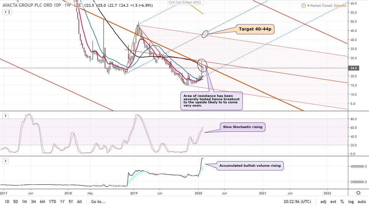 #AVCT resistance zone between 24.5-26.6p is being severely tested on strong bullish momentum and high volume. I am expecting price to breakout of this level and head to the target zone of 40p-44p in the short term. Strong Buy!!!pic.twitter.com/2q280FoRSI