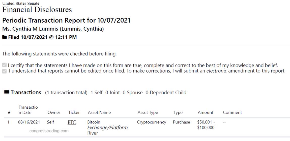 And that's in addition to the $100k - $250k worth of BTC she already disclosed in her annual report back in May - https://efdsearch.senate.gov/search/view/annual/5a9f95fe-06e6-4abf-866f-d1d174e510e9/ …
