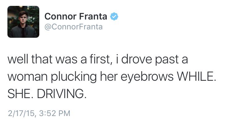 @ConnorFranta REMEMBER THE TIME YOU SAW SOMEONE PLUCKING THEIR EYEBROWS WHILE DRIVINGThanks. Twitter will use this to make your timeline better. UndoUndo