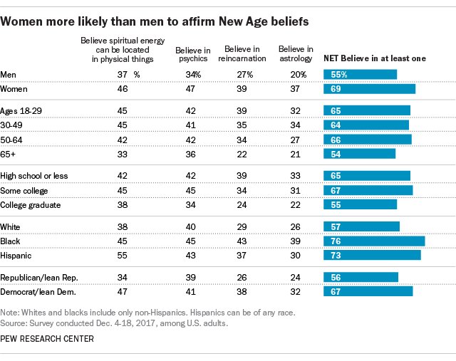 Believe in psychics People with no particular religion 52% Catholics 46% Evangelicals 33% Agnostics 31% Atheists 10% http://www.pewresearch.org/fact-tank/2018/10/01/new-age-beliefs-common-among-both-religious-and-nonreligious-americans/ …pic.twitter.com/bELTJD7evT