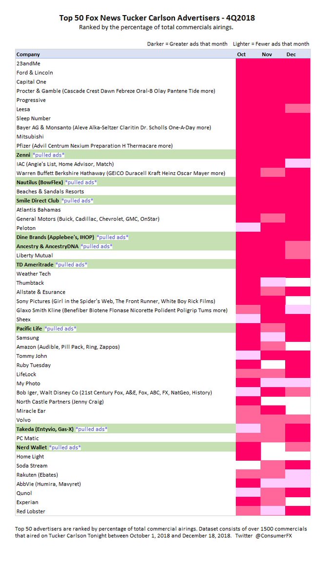 (Update) Tucker Carlson - Top 50 advertisers 4Q2018 (Oct-to-date) revised with the current status of advertisers. Although top advertisers EXCEPT