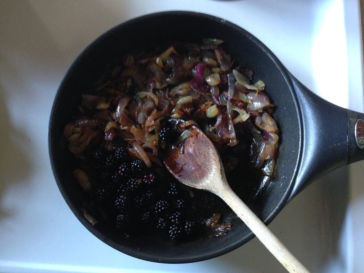 Blackberry Onion Sauce: caramelize@low onion/2T olvoil&vermouth; +c berry/t lemzest&soya&balsamc/dash cinn&s+p. Crush,simmr; deglaze+2T h2o.