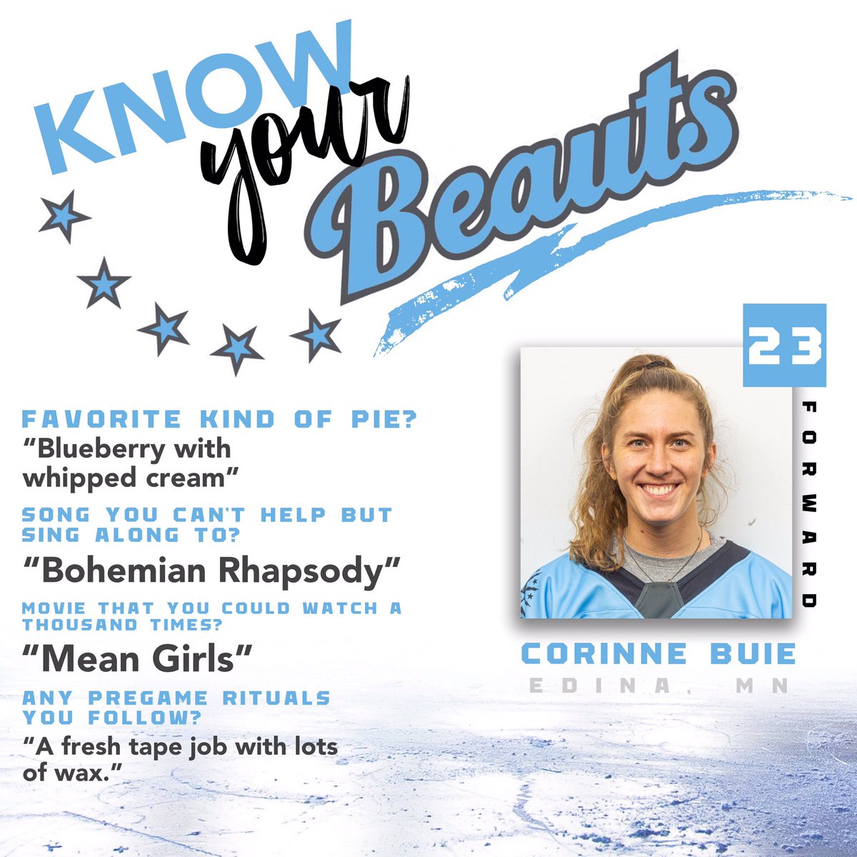 Today’s “Know Your #Beauts” is none other than our fearless leader,@corinnebuie! She’s our captain AND she enjoys blueberry pie