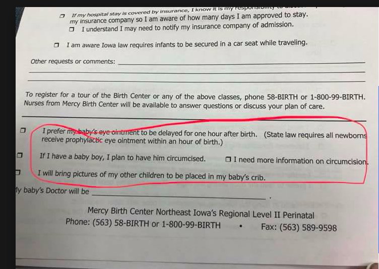 In many states the eye ointment is a legal requirement, & parents who try to refuse in a case where it is unnecessary (i.e. most cases) will have hospital staff threaten a report to CPS. Our medical system claims to be patient-centric. But it's really just about maximizing $$