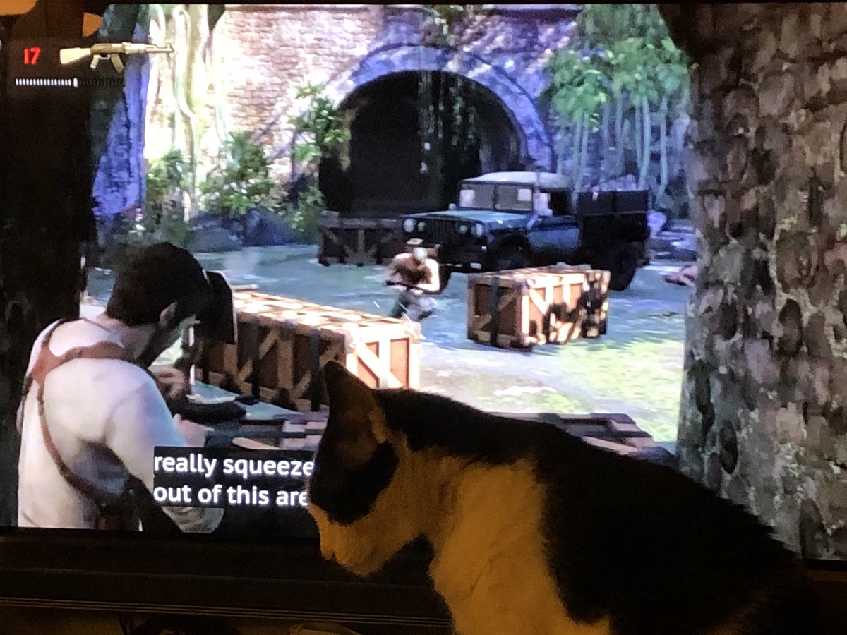 my cat when I try to watch TV (this is her favorite part, note the tiny cartoon cat on screen)pic.twitter.com/YHJ4wMr904