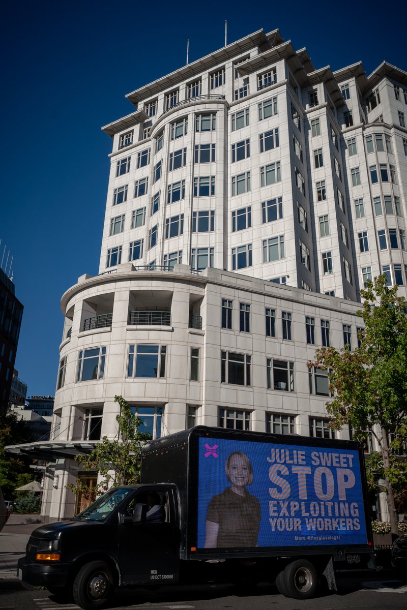 NOW: We're outside the @Accenture DC office! Together with moderators we're demanding@JulieSweet pays her workers fairly. Accenture has a $500 million a yr contract with Facebook, Julie took home $17 million last year. Workers are paid poorly, fed up and demanding better.