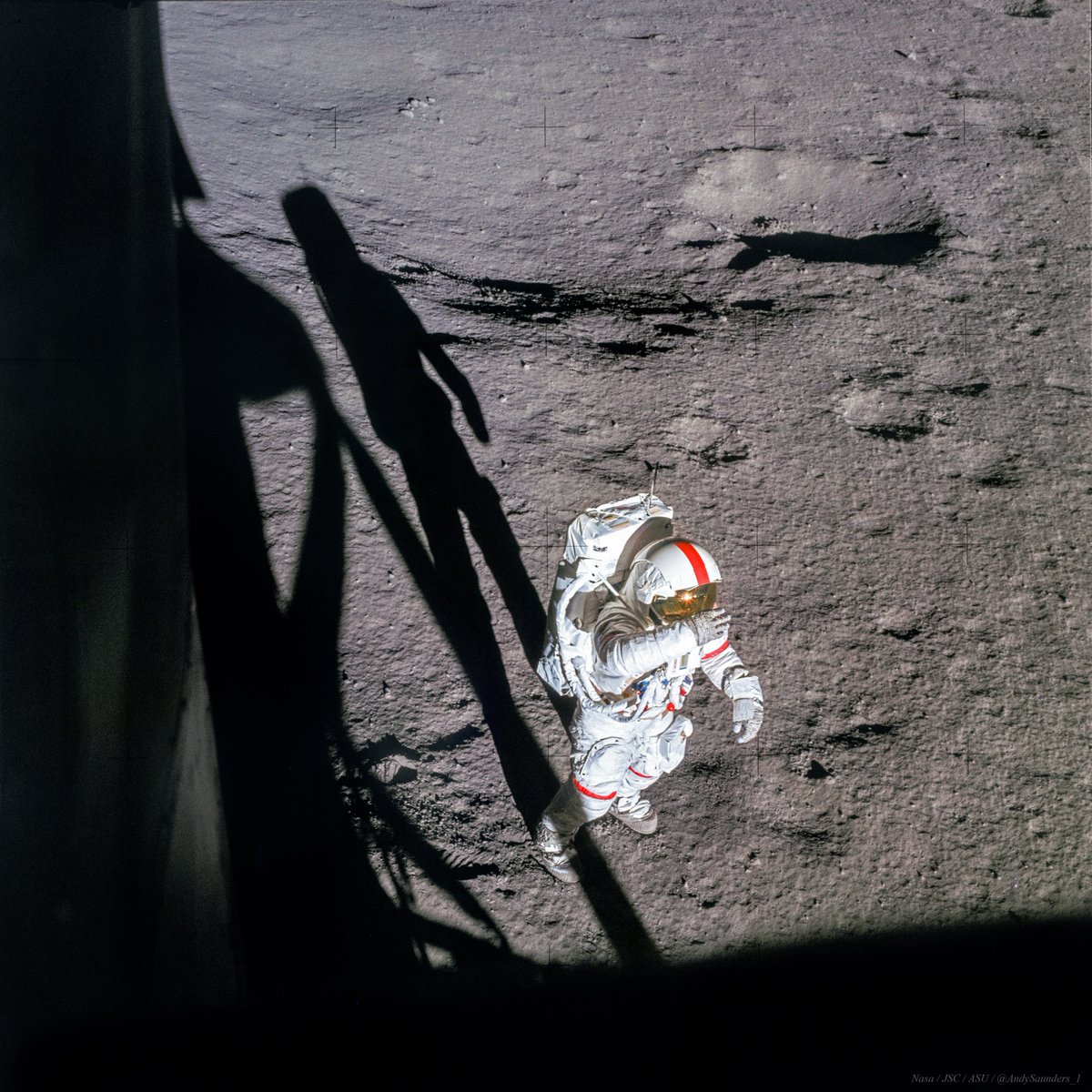 #OTD 49 years ago Apollo 14 Lunar Module, Antares touched down at Fra Mauro. Alan Shepard, first American in space became the world's 5th moonwalker. Pin sharp, perfectly exposed image of Shepard, and the LM (landing at an 8deg tilt) reprocessed for#apollo50thpic.twitter.com/VCpdumOE6q