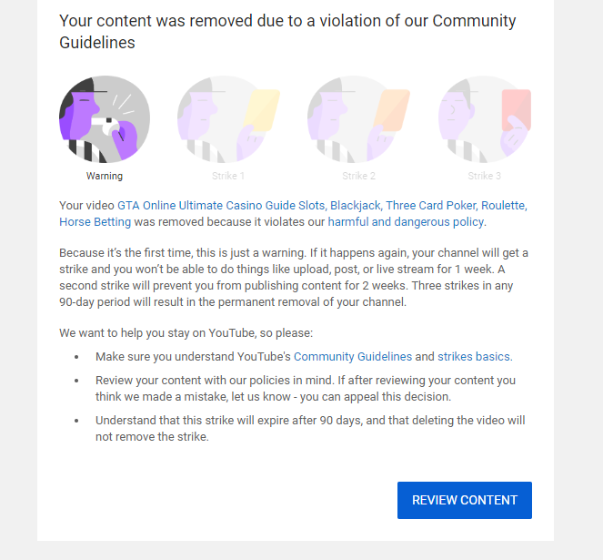 If you guys are wondering where my casino guide video is. Youtube took it down declaring it is "harmful and dangerous". I got a warning as well I am appealing the decision. I apologize to everyone who cannot watch it anymore. I will let you know if Youtube reinstates the videpic.twitter.com/pyP2QDMeDD