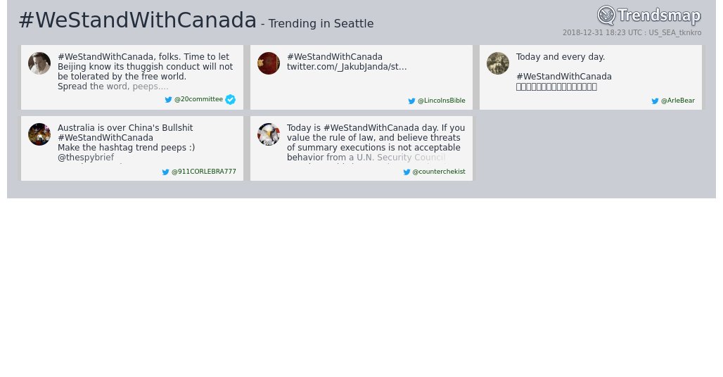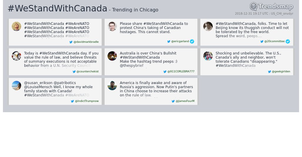 #WeStandWithCanada went trending in numerous cities & countries. Job very well done, patriots. I hope China is paying attention and chooses to behave in a manner befitting the civilized world we live in.Thanks. Twitter will use this info to make your timeline better. UndoUndo -