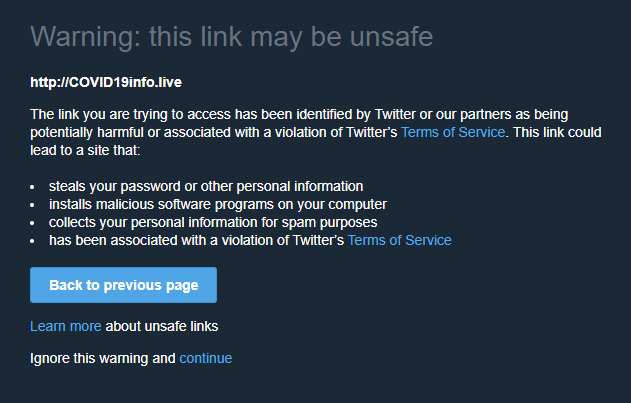 @Twitter#COVID19 For an unknown reason Twitter's system has decided that covid19info,live is "unsafe". I can assure all users both existing and new, there is nothing malicious about the site. If you see the following message, please ignore itpic.twitter.com/U4GArUt5gK