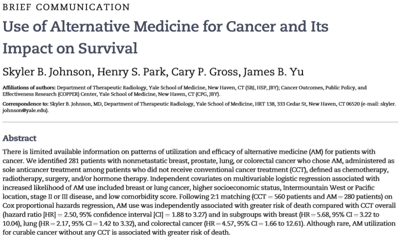 #breastcancer treatment. We've found that patients who choose ONLY alternative therapy (in leiu of) conventional treatment for curable cancers have a higher risk of death https://bit.ly/36vc9UK https://twitter.com/kathryniveyy/status/1214261780723195906 …pic.twitter.com/jfZdjFdpml