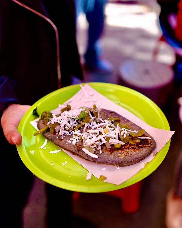 Tlacoyo made with blue corn and filled with favs beans. This is a pre- Hispanic dish. I ordered one with cactus (nopales) on top and cotilla cheese as well. Excellent. Also sell one filled with chicharrones.pic.twitter.com/IWDz6AmMbA