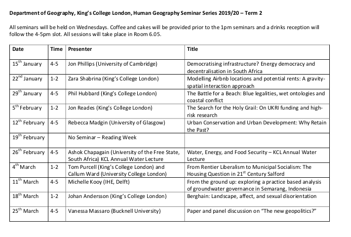 @kclgeography Human Geography seminar series. All in Bush House NE6.05, either Weds lunchtimes or evenings as indicated. Please email me for more details.pic.twitter.com/q0BL2fKaa8