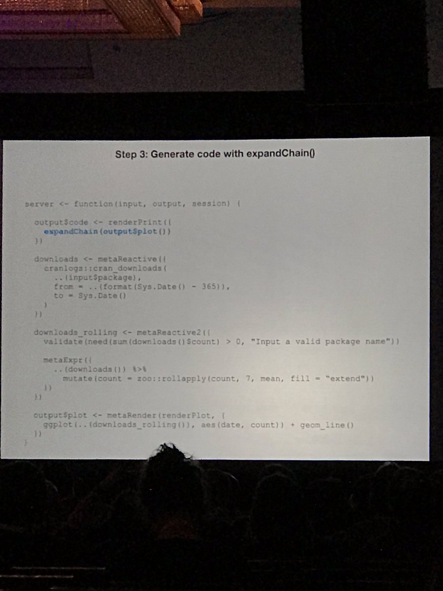 #shinymeta by@cpsievert at@rinpharma: 1. Identify and change domain logic; 2. Identify and mark reactive reads; 3. Generate R code#rinpharma#rstats#shinypic.twitter.com/4ulVjhknE4