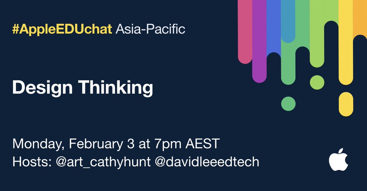 Monday #AppleEDUchat is back in#AsiaPacific Let’s talk#DesignThinking. Check the times and see you there?@AppleEDU#dtk12chat#dtedu#edtech#aussieED#STEAM#edchatpic.twitter.com/qWv1FkPedn