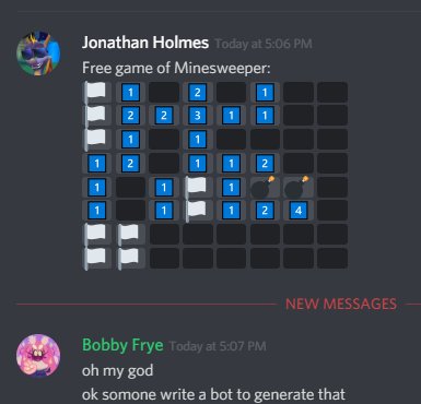 @discordapp now supports spoiler tags to hide text. I figured it would be a cool way to play some emoji Minesweeper.@modernmodron suggested that it would make a cool bot.#GameDevpic.twitter.com/3jkvGUCMQy