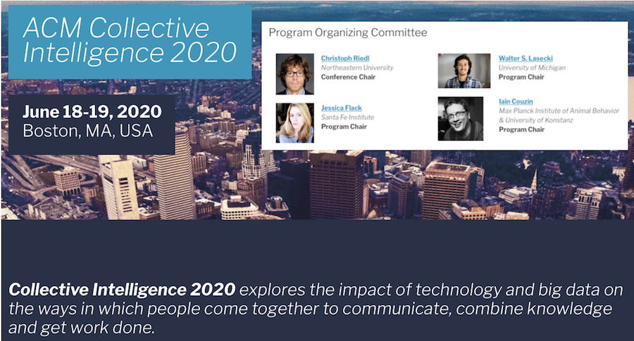 Call for papers to ACM Collective Intelligence 2020 conference: abstract submission deadline is March 1. Conference will take place in Boston, MA and Denmark, Copenhagen on June 18-19, 2020. http://ci2020.weebly.com