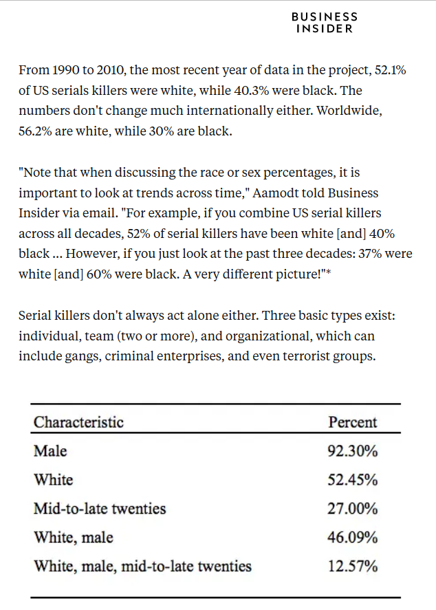 Apparently there are decent databases of serial killers. The stereotype of it being particularly white crime type seems not true. "Despite being only 13%..." applies here too. Mean IQ of serial killer was 95. https://www.businessinsider.com/a-surprising-look-at-the-average-serial-killer-2015-5?r=US&IR=T …pic.twitter.com/udJ8mMtAwt