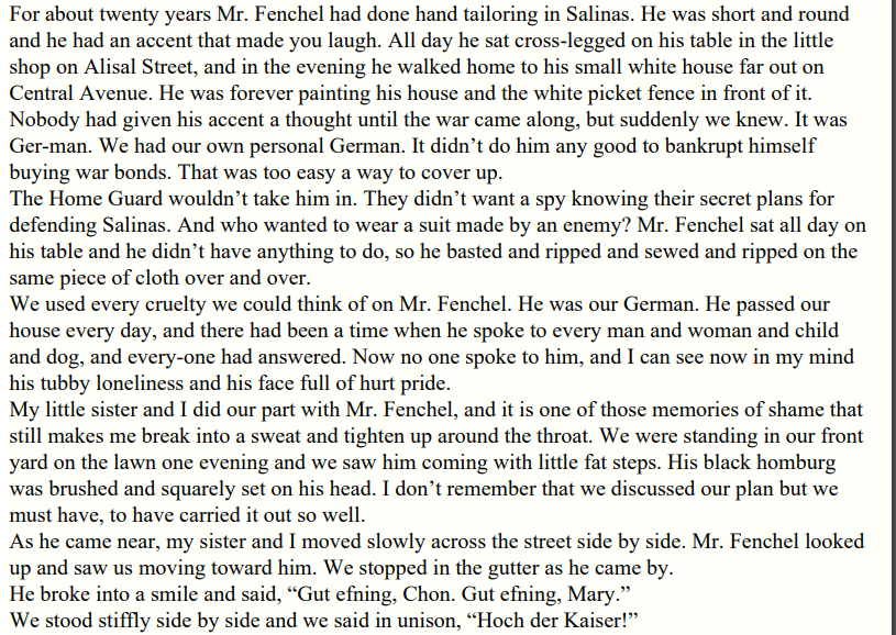 There's a very moving section of Steinbeck's East of Eden describing how the people of Salinas pathetically bullied the industrious village German during the war:pic.twitter.com/R2QLgBvcIp