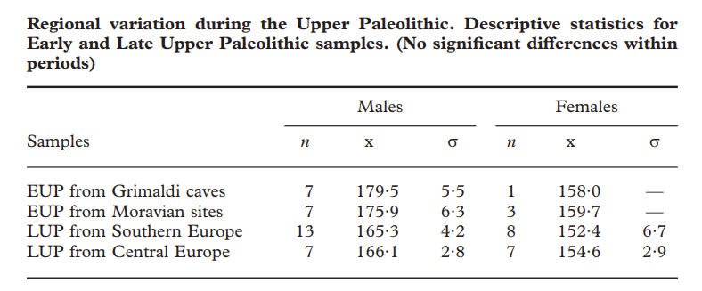 But WHGs are the Mesolithic West Euro pop-- shortest in the table above. The Early UP Euros were the Aurignacians & Gravettians-- ie, "Goyet" and Vestonice" types. I believe a recent polygenic study from the Baltic also associated WHG variants with shorter, stockier body types
