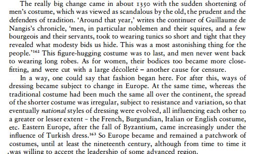 Fernand Braudel's history of capitalism has a section on fashion; in it he writes that for much of history the dress of a civilization was static, unchanging except in the case of foreign conquest. This began to change in Europe very early, ~1350, with the end of Roman tunics.pic.twitter.com/OfTkEsntjf