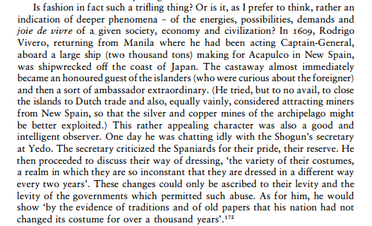 In 1609 Rodrigo Vivero was shipwrecked in Japan and was lectured by a man there that changing European fashions made them all look silly. He could show "by the evidence of traditions and of old papers that his nation had not changed its costume for over a thousand years."pic.twitter.com/5qjHMJFeIf