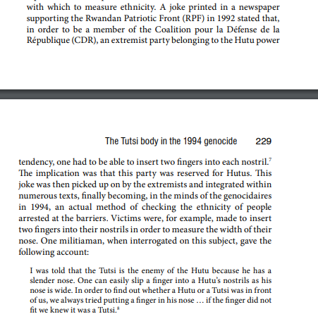 The ‘94 Hutu genocidaires were aware of ethnic differences in the nose and devised a crude scientific test to establish who was who: they would shove their fingers up someone’s nose and if they couldn’t fit them up the narrow nostrils, the suspect must be a Tutsi.pic.twitter.com/90UFT0jFb2